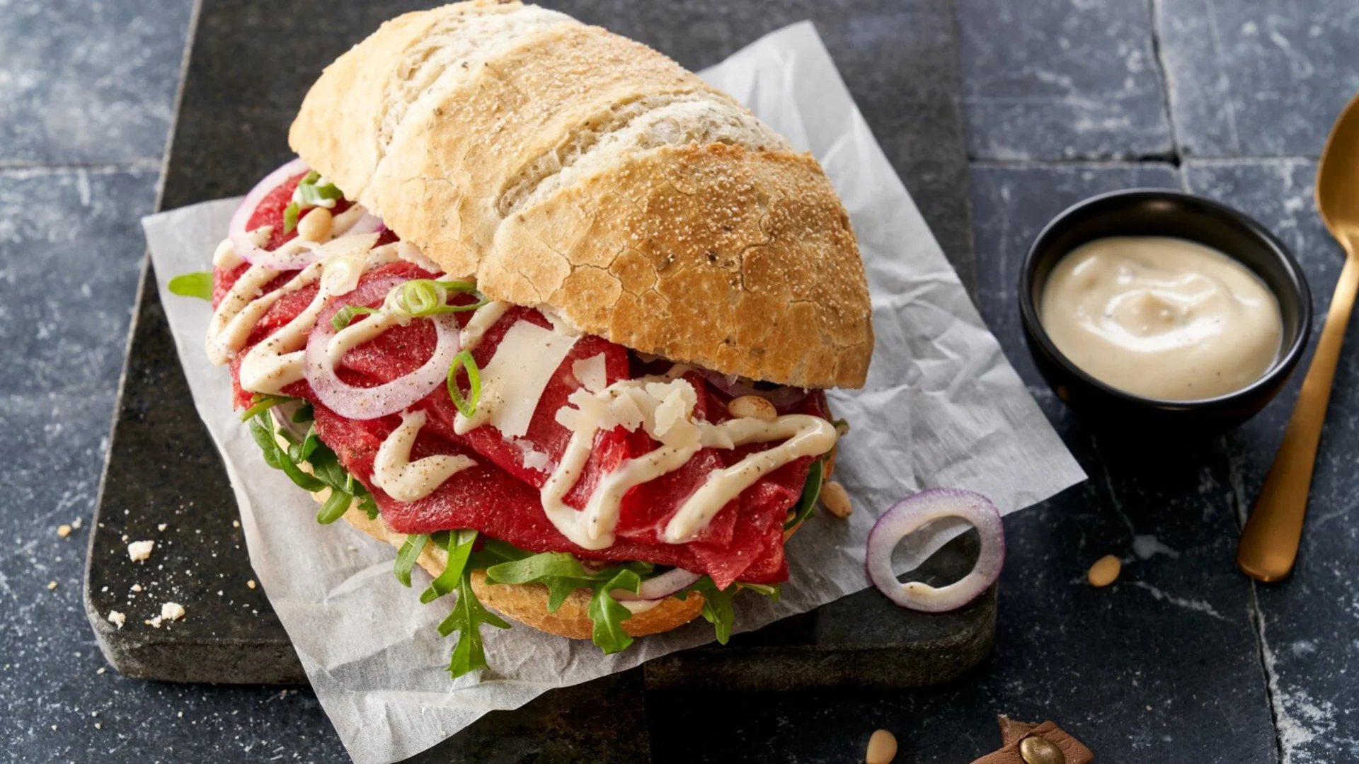Rundvlees, zontomaat, pittenmix, truffel mayonaise, parmezaanse kaas